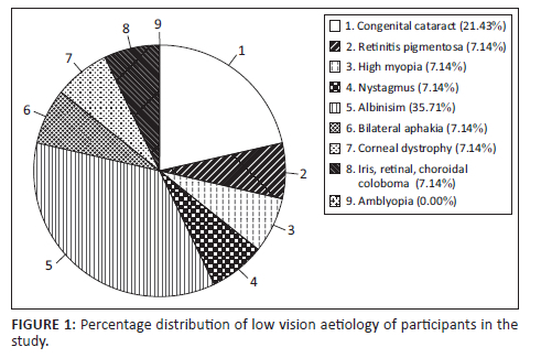 The demographic profile of the participants was black South Africans aged 6 years to 19 (mean = 13.86 ± 3.34) years. This included 80% females (n = 12) and 20% males (n = 3). The disparity in gender could be attributed to a greater population of females enrolled at the school, with females appearing more enthusiastic to participate in the study than males. Albinism (35.7%) and congenital cataract (21.4%) were the most common causes of low vision (Figure 1). Other causes were corneal dystrophy, coloboma of the iris, retina and choroid, retinitis pigmentosa, myopia and nystagmus as well as combination of the listed conditions.