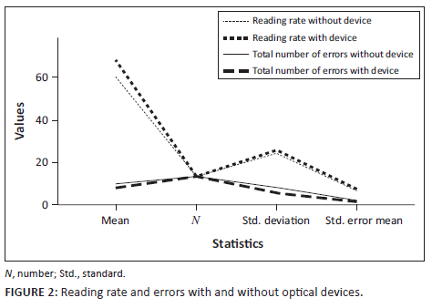 The mean reading errors made by the participants and their reading rate without and with the low vision optical devices were 10 epm (± 8) and 8 epm (± 6) and 59.32 cwpm (± 24.08) and 67.1 cwpm (± 25.6), respectively (Figure 2). An increase in reading rate was observed from Grade 1 to 10 both without and with the low vision devices except for one participant in Grade 11 whose reading rate was 39 cwpm and 66 cwpm, respectively.