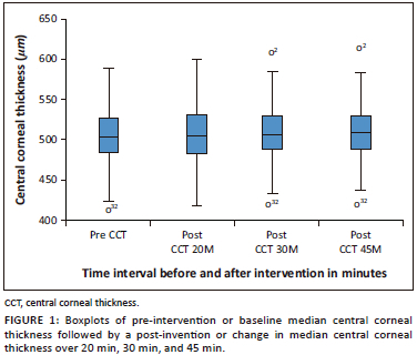 Figure 1 shows a boxplot describing median-baseline CCT followed by a change in median CCT over 20 min, 30 min, and 45 min. The median CCT before the intervention was 504 μm, which rose to about 507 μm after 20 min, and almost remained constant at 30 min. However, there was an increase of about 510 μm after 45 min. Although there was an increased median in terms of CCT, there was a normal distribution of CCT before and after intervention across the follow-up duration. The minimum score of CCT between baseline and post-intervention remained constant. However, there was a constant increase in the maximum CCT score over three consecutive times by approximately 10 μm, from 590 μm baseline to 600 μm, 607 μm, and 612 μm. Moreover, there was an overlap in the distributions for CCT.