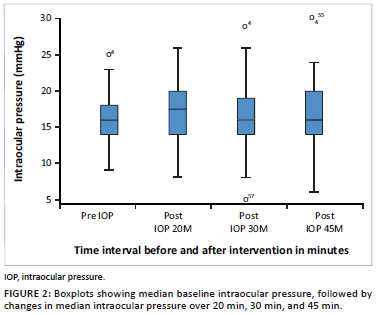 Moreover, this study found an average IOP of 15 mmHg-16 mmHg, which agrees with the standard clinical average IOP.40 The mean change was 0.88 mmHg ± 0.90 mmHg, 0.49 mmHg ± 0.98 mmHg, and 0.88 mmHg ± 1.27 mmHg, for the post-intervention times measured, respectively. The correlations between the baseline IOP and post-intervention IOP were statistically significant across the intervals. However, the mean change in IOP between baseline IOP and post-intervention was statistically insignificant across the intervals.