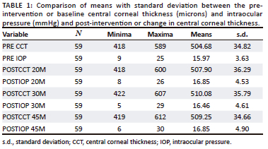 Diagnostic mydriatic agents are routinely used in most eye clinics; however, they can potentially increase IOP.8,14,30 Furthermore, there is a paucity of similar studies in South Africa, including where there is measurement of CCT. Therefore, this study sought to understand the effect of 1% tropicamide as a mydriatic ocular solution in a clinical South African context on the CCT and IOP post mydriasis in three different intervals, namely 20 min, 30 min, and 45 min.
