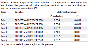 Table 2 shows the correlations for the paired samples. The data showed a positive correlation between baseline CCT and post-dilation CCT at all three intervals. The results were strong enough to yield a statistical significance with a p-value of less than 0.001. The correlation of the IOP (pair four, five and six) was weak even with the increase in time. Furthermore, the results were strong enough to yield a statistical significance with a p-value of less than 0.05.