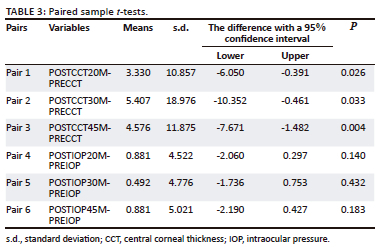 A codebook was created to code the variables for analysis. The data were entered into Microsoft Excel for sorting and then uploaded to Statistical Package for Social Science (SPSS, Inc., Chicago, IL, United States) software version 28 for analysis. Shapiro-Wilks' tests were used to test the data for normality33 and the data were normally distributed, with p > 0.198 for baseline IOP, and post-intervention, p > 0.196, p > 0.720, and p > 0.306 for 20 min, 30 min, and 45 min, respectively. Furthermore, for the CCT, baseline p > 0.854 and post-intervention, p > 0.540, p > 0.628, p > 0.774, for 20 min, 30 min, and 45 min, respectively. Therefore, parametric tests for statistical analyses were used to analyse the data and descriptive statistics such as mean and standard deviation (s.d.) were used. Medians were used where outliers were relevant. Correlation and paired t-tests were used to compare baseline and post-intervention variables over three consecutive times. A p-value of < 0.05 was considered statistically significant.