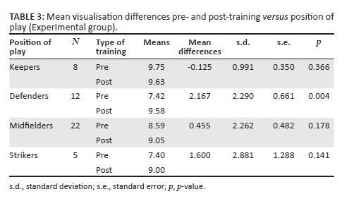 When compared with results for Buys and Ferreira,4 visualisation in the control group remained 'needs immediate attention'. Only strikers could achieve 'average' mean visualisation (Table 2). Strikers started the assessment with 'above average' visualisation (Table 3), and after training, the performances remained 'above average'.
