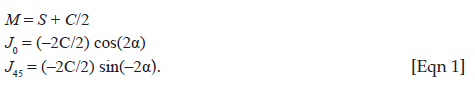 The resultant prescription is expressed as a power vector for all eyes. Power vectors are a geometrical representation of sphero-cylindrical refractive errors in three fundamental dioptric components: Spherical equivalent (M), Jackson Cross-Cylinder (JCC) axis at 0°/180° (J0) and JCC axis at 45° (J45).17 Manifest refractions in conventional script notation [sphere (S), cylinder (C) and axis (α)] were converted to power vector coordinates, and overall blurring strength was obtained with the following formulae14: