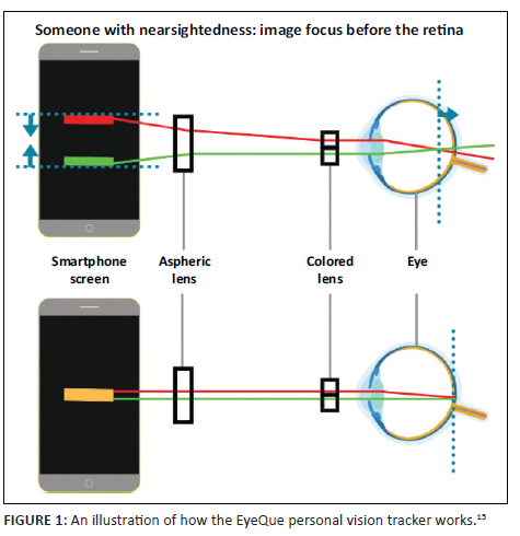 The EyeQue Personal Vision Tracker (EPVT) is a self-administered home-based vision testing device and mobile application that allows individuals to measure their own refractive error and track changes over time.7 The method involves a small optical device that attaches to any smartphone with the recommended specifications from the manufacturer. The device can determine the spectacle prescription for myopia, hyperopia, and astigmatism. The method involves looking into the device and responding to visual prompts on the smartphone screen. The manufacturer declares that EPVT is not a substitute for a comprehensive eye examination by a qualified optometrist or ophthalmologist; however, the application potentially allows users to purchase spectacles on completion of the test. This implies that the device should be as accurate as the results obtained by, for example, an optometrist. Should it not be, the consequences of patients wearing inaccurate spectacle prescriptions include visual discomfort, reduced visual acuity (VA), eyestrain, fatigue, distorted perception (depth perception and spatial awareness) and overall reduced productivity.