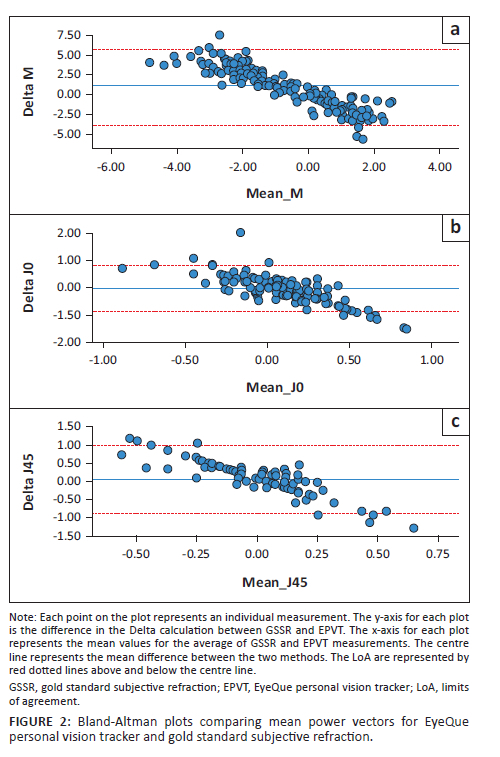 Bland-Altman analysis (Figure 2) showed bias between the GSSR and EPVT measurements (n = 208) for Delta M, with the EPVT reporting more myopic spherical equivalent values on average than GSSR. This is indicated by the centre line that is deviated from zero, indicating a systematic bias of the EPVT for measuring refractive error. Points above and below the centre line indicate the direction and magnitude of the difference between the two methods for each measurement. There was a trend for larger magnitude measurements of refractive error by EPVT. Outliers represent individuals for whom the methods of measurement have a substantial discrepancy. Measurements for J0 had the greatest number of possible outliers that fell outside of the upper and lower 95% limits of agreement (LoA).