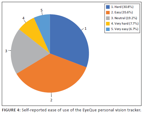 Overall, 32.7% of the participants were unsatisfied with the use of the EPVT. Most participants (88.5%) reported that they prefer to physically go to an optometrist for future eye tests, and 1.9% (n = 2) said they preferred to use the EPVT. There was a small difference between those participants who found the device hard to use (30.8%) and those who found it easy to use (35.6%) (Figure 4). Furthermore, most participants (53.8%) felt that the GSSR was quicker. With regard to comfort, GSSR was considered more comfortable (46.2%), while 43.3% did not feel any difference between the two testing methods.