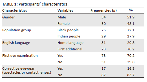 There were 104 (208 eyes) participants recruited for the study. Most were African (72.1%), while the rest (27.9%) were Indian. The gender of the participants was evenly distributed; there were 54 (51.9%) males and 50 (48.1%) females. The age range was 18-33 years with a mean of 21.47 ± 2.8 years. For most participants, this was their first eye examination (70.2%) and most spoke English as a first additional language (70.2%). Table 1 details other participant characteristics.