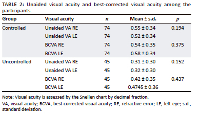 CONTRIBUTION: This study observed maculopathy grade M1 and myopia were more common in uncontrolled DM, and vision function was inversely correlated with age (p < 0.05