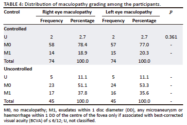Regarding maculopathy, most of the patients with controlled DM, 58 (78.4%), had no maculopathy; only 14 (18.9%) had grade M1 of maculopathy. While in the patients with uncontrolled DM, no maculopathy was found in 23 (51.1%), and grade M1 maculopathy was found in 17 (37.2%). Maculopathy among the patients with controlled and uncontrolled DM was statistically not significant (p = 0.361), as shown in Table 4.