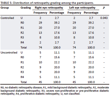 RESULTS: Females comprised 53.8% of patients, mean age of 58.8 ± 8.5 years. Uncontrolled DM was found in 37.8% with a mean duration of 10.5 ± 4.8 years. Myopia was the most common refractive error found in 57.8% of the uncontrolled group, followed by emmetropia (17.8%). Whereas in the controlled group, 47.3% were hyperopic and 39.2% were myopic. Maculopathy grade M1 was found to be 37.8% in the uncontrolled group and 18.9% in the controlled group, with no significant difference (p = 0.361). Conversely, the difference in retinopathy between the two groups was statistically significant (p = 0.043