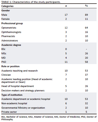 All participants invited to participate in this study were experts in different domains of eye care and were from different organisations in Saudi Arabia. The participants included consultant ophthalmologists, consultant optometrists from specialised hospitals, academic professors from ophthalmology and optometry university departments, and pharmacists with experience in the field of ocular pharmacology. All participants had ≥ 10 years of experience and were professionally active. In addition, leaders from the MoH and other governmental organisations involved in policy formulation pertaining to eye care and management were invited. Invitations were sent via emails, phone text messages, or phone calls.