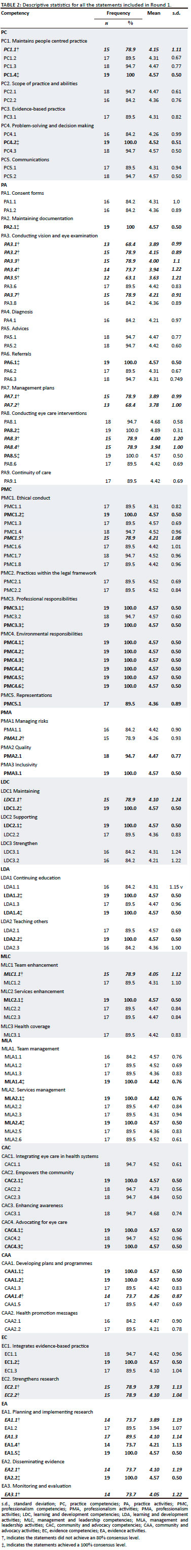 The majority of statements that did not achieve consensus were related to domain P, which relates to the ability of optometrists to perform vision and eye examinations accurately in clinical settings (11 statements). A few participants suggested that optometrists in Saudi Arabia must receive additional practical training in hospitals under the supervision of an expert, such as an ophthalmologist or an optometrist with additional training (for instance, a residency certificate) in PEC or the management of ocular diseases from international institutes before being considered qualified to conduct eye examinations, diagnose ocular diseases, and prescribe proper treatment. The second most common statements that did not reach consensus were related to domain E, which relates to planning, strengthening, and implementing research (6 statements). These statements and the remaining statements that did not reach consensus were modified according to the comments and suggestions of the experts and included in the second round. Additional statements were not provided by the participants in this round.