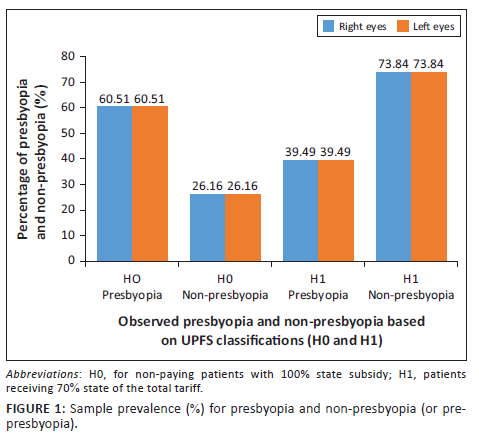 The occurrence of presbyopia in the H0 records is similar at 60.5% for the right and left eyes of the present study (see Figure 1) and does not agree with that of previous studies. However, the occurrence of presbyopia in the H1 records at 39.5% is similar to other studies. The sample prevalence of presbyopia in both H0 records for this study is larger than that of other studies with prevalence of 30.4% and 59%,37,38 but for the H1 records is smaller than that of another previous study where the prevalence of presbyopia is 59%.37