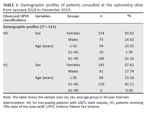 Over the two years, 513 clinical records (cases) were sampled and analysed. The sample consisted of records for patients of African descent who visited a rural Optometry Clinic. The mean age and standard deviation (s.d.) of the sample were 47.4 ± 20.6 years. Table 1 shows a summary of the demographic profiles of patients seen at the clinic based on the UPFS classified records at the district hospital. Female records accounted for a larger percentage than male records, with 37.6% for H1 and 30% for H0. There were no observations for other categories such as H2, H3, or private patients covered by the medical aid schemes or healthcare insurance. The largest proportion of H0 sampled records were 165 (32.2%) for patients in the age group 61 years to 90 years. The smallest proportion of H0 sampled records was 10 (2.0%) for patients in the age group 31 years to 60 years. For H1 records, the largest proportion was 216 (42.1%) in the age group 31 years to 60 years, and there were no observations in the age group 61 years to 90 years.