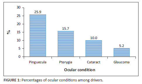 A total of 150 drivers (25.9%) and 91 drivers (15.7%) had pingueculas and pterygia, respectively (Figure 1).