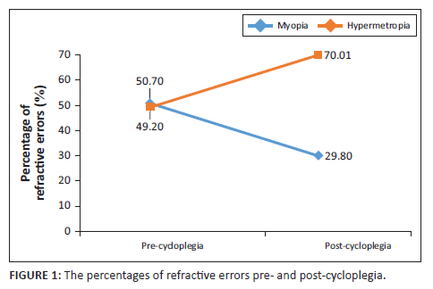 In our study, myopia significantly decreased from 50.7% before cycloplegia to 29.8% post-cycloplegia (P = 0.001); however, we found a significant increase in the percentage of the hypermetropia, which increased from 49.2% before cycloplegia to 70.01% after cycloplegia (P = 0.001) (Table 5 and Figure 1).