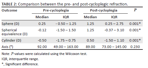 We compared the pre- and post-cycloplegic refractions, and we found that the sphere, spherical equivalence and cylinder had significant hypermetropic shift after cycloplegia (P = 0.001) (Table 2). The median sphere changed significantly from 0.25 D before cycloplegia to 1.25 D post-cycloplegia with a median difference of 0.75 D (P = 0.001). The median SE changed from -0.12 D before cycloplegia to 1.25 D after cycloplegia with a median change of 1.05 D (P = 0.001). Also, the cylinder had changed from -0.5 D pre-cycloplegic to 0.5 D after cycloplegic with a median difference of 0 D and mean difference of 0.4 D (P = 0.001). However, we found no significant difference between the pre- and post-cycloplegic axis (P = 0.23).