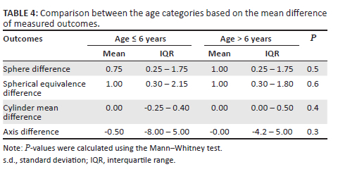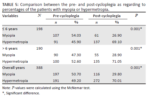 Our study included 388 children with either a myopic or a hypermetropic refractive error. Table 1 shows the demographic characteristics of the patients; the median age of the patients was 6 and IQR 5-8 years, with 51% of the included patients under the age of 6 years and other patients were in the age category of > 6 years. Fifty-one per cent of the patients were females. Myopia represents 51% of the included children and hypermetropia represents the remainder.