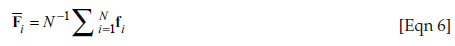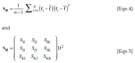 where SII is the stigmatic variance, SJJ and SKK are ortho-anti-stigmatic and oblique anti-stigmatic variances, respectively, while SIJ (= SJI) is the stigmatic ortho-anti-stigmatic covariance, SIK (= SKI) is the stigmatic and oblique anti-stigmatic covariance and SJK (= SKJ) is the ortho- and oblique anti-stigmatic covariance. Given that Sff is symmetrical, only six entries are distinct; variances are always positive, but covariances can be positive or negative. Means, variances and covariances are essential statistics for distributions of refractive errors, and Equation 6 is the sample mean: