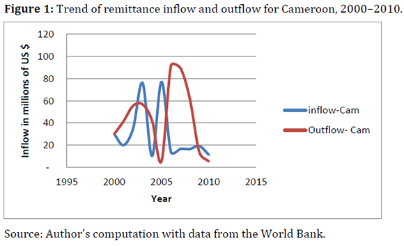 Figure 1 shows the trend of remittance inflows and outflows for Cameroon from 2000 to 2010. It can be seen that the inflow of remittances into Cameroon has been inconsistent over the 11-year period. It peaked in 2003 at US$ 76 million, rising from US$ 35 million in 2002. It then fell to US$ 10.3 million in 2004 and rose to its highest value within the 11-year period of around US$ 77 million in 2005. From there onwards, it was consistently low from 2006 to 2010, ranging from US$ 11.4 million to US$ 19.2 million. The inconsistency in remittance inflows to Cameroon is associated with a generally falling trend in the amount of remittance inflows into the country. Ngome and Mpako (2009) also found that over the years remittances have been falling in Cameroon. They identified a number of reasons for this: the high cost of money-transfer fees, the breakdown of trust in carriers of informal remittances, the belief that hard-earned money sent home by migrants is squandered by family members on luxury goods instead of being invested in productive activities and, lastly, the wide dispersal of Cameroonians in the diaspora which makes it difficult for them to remit money through informal channels.