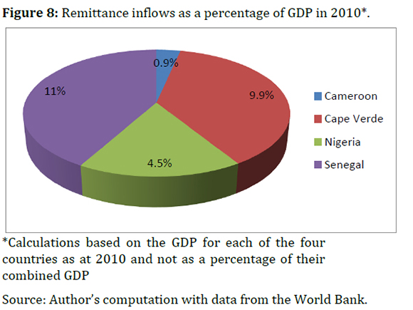 Figure 8 shows the remittance inflows as a percentage of GDP in 2010 for Cameroon, Cape Verde, Nigeria and Senegal. This year was chosen because remittances are said to be counter-cyclical (see UNESCAP, 2007), tending to increase during times of crisis. Thus, this figure displays the contribution of remittance inflows to GDP in 2010, one year after the global financial crisis. In 2010, the GDP of Cameroon was US$ 23.7 billion and remittances made up 0.9% of this figure. This reinforces the analysis above, that there is virtually no relationship between remittance inflows and GDP in Cameroon. The GDP of Cape Verde was US$ 1.7 billion and remittances formed 9.9% of this amount. Although this is significant, studies by other researchers (see International Monetary Fund, 2008; Ronci et al., 2008; Akesson, 2010) have revealed that remittance inflows as a percentage of GDP have steadily declined over the years, falling from around 25% in the 1970s to barely 9% in the 2000s. The GDP of Nigeria was US$ 369.1 billion and remittances formed 4.5% of this value. This percentage is relatively low considering Nigeria ranks first as the recipient of the greatest amount of remittances in sub-Saharan Africa (see Orozco, 2003; Ukeje & Obiechina, 2013). Lastly, the GDP of Senegal was US$ 13 billion and remittances formed 11% of this amount. This supports the literature that remittances to Senegal are usually used for productive purposes (see Orozco et al., 2010; Randazzo & Piracha, 2014). It can therefore be concluded that the percentage of remittance inflows contributed the most to GDP in Senegal (11%) and remittance inflow as a share of GDP in 2010 was the lowest in Cameroon (0.9%).