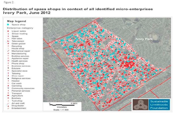 The data used in this article comes from surveys conducted with over 1050 spaza shopkeepers nationwide. More specifically, the data comes from eleven local-area censuses conducted in townships and informal settlements in Cape Town, Gauteng and Durban by the Sustainable Livelihoods Foundation (SLF) from 2011-20131. In each of the eleven sites, a team geo-located each identifiable business on each street, and conducted semi-structured surveys with all the traders from each of the main business types, including spaza shops. The surveys were conducted by the SLF team in English, or in the language of the respondent where possible (the team included isiXhosa, Afrikaans, Isizulu and Somali speakers). Across the whole sample, the survey revealed shopkeepers from the following countries: Angola, Bangladesh, Burundi, DRC, Egypt, Ethiopia, Lesotho, Mozambique, Namibia, Pakistan, Rwanda, South Africa, Tanzania and Zimbabwe. Figure 1 is an example of the entire census for one area, Ivory Park, in Gauteng. The spaza shops are highlighted in Figure 2. The areas and number of spaza shops by nationality are described in Table 1 below.