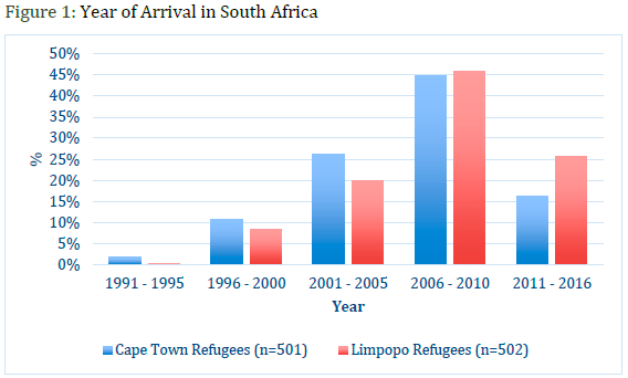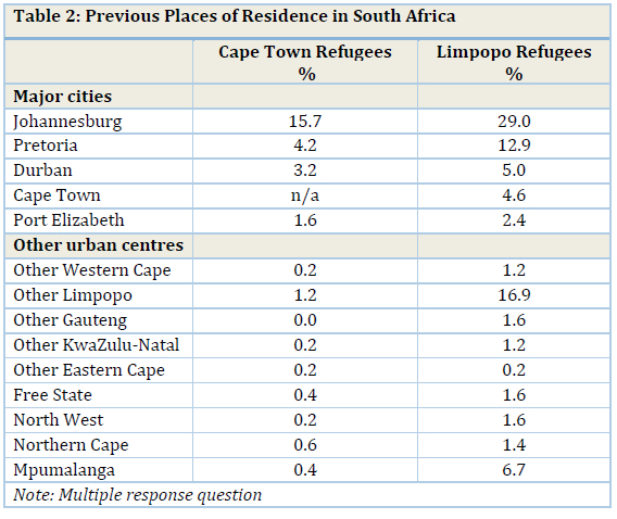 In the Limpopo sample, previous places of residence were dominated by the large cities, particularly Johannesburg (29%) and Pretoria (13%), but also Durban (5%) and even Cape Town, which is nearly 2,000km away (5%). The movement of refugees from Limpopo to Cape Town was much more limited. As many as 17% of the Limpopo refugees had lived in another town in the province, suggesting the existence of some intra-provincial mobility. This kind of movement was virtually absent in the case of Cape Town and the Western Cape Province. In the Cape Town sample, the majority of the 28% who had lived in another urban area came from Johannesburg, with much smaller numbers from cities such as Pretoria and Durban.