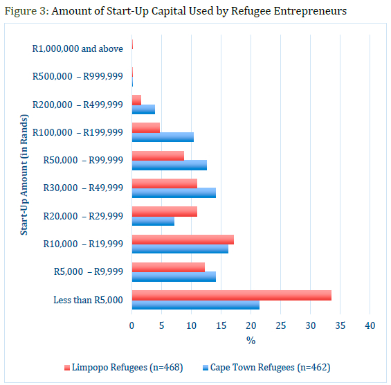 Despite the similarities in sources of start-up capital, the amounts needed to establish a business did differ. In Limpopo, the sampled refugee entrepreneurs seemed to be able to start businesses with less capital (Figure 3). 34% percent had less than ZAR 5,000 compared to 21% of the Cape Town refugee entrepreneurs, and 63% had less than ZAR 10,000 compared to 52% of the Cape Town entrepreneurs. At the other end of the scale, 27% of the sampled Cape Town refugees had more than ZAR 50,000 in start-up capital compared to only 15% of those in Limpopo.