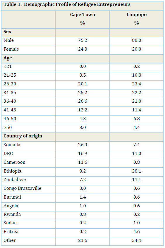This section of the paper compares refugee business owners in Cape Town with those in small town Limpopo to ascertain if there are any significant differences in their respective socio-demographic and migration profiles. First, male refugee entrepreneurs clearly dominate in both areas, with only 20-25% of business owners being women (Table 1). This is generally consistent with the predominantly male character of refugee migration to South Africa. The entrepreneurs in both locations tend to be relatively young, with 80% in Cape Town and 77% in Limpopo being under the age of 40. Very few entrepreneurs in either location were over the age of 50. Accepting the International Labour Organisation definition of "young people" in Africa as anyone under the age of 35, this would mean that 54% of those in Cape Town and 57% of those in Limpopo are young entrepreneurs (Kew, 2015). There are no significant differences between the two groups of refugee entrepreneurs in terms of age profile. However, the difficulties and challenges facing youth entrepreneurs in South Africa, and how these are addressed by refugee youth, warrant further investigation (Fatoki & Chindoga, 2011; Gwija et al., 2014).