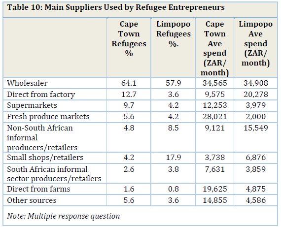 The establishment and growth of sampled refugee businesses has economic spin-offs for a variety of South African stakeholders. The first beneficiaries are formal sector suppliers including wholesalers, supermarkets, fresh produce markets, retailers and manufacturers. Around two-thirds of the sampled refugees in both Cape Town and Limpopo purchase supplies from wholesalers, who are easily the largest beneficiaries of their patronage (Table 10). Other beneficiaries vary in relative importance, reflecting the difference between operating in a large city and a small town. For example, refugees in Cape Town are more likely to patronise supermarkets and factories while those in Limpopo are more likely to patronise small shops. The fact that more Cape Town refugees purchase directly from farms is primarily a reflection of the existence of a market gardening area (the Philippi Horticultural Area) within the city limits (Battersby-Lennard & Haysom, 2012). The average monthly spend at wholesalers was very similar in both Cape Town and Limpopo.