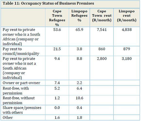 While over half of both groups of refugees paid rent to a private South African owner, this was more common in Limpopo (almost 66%) (Table 11). However, the average monthly rentals paid to landlords were very similar: ZAR 4,838 in Cape Town and ZAR 4,555 in Limpopo. Renting also provides refugees with a modicum of protection. As one noted, "If your landlord is respected or feared, then you are okay because the thugs will not come and break in."3 The Cape Town refugee entrepreneurs were more likely to own their business premises although the numbers were small (7% compared to 2% in Limpopo). Fourth, the municipal government has a direct financial interest in its dealings with refugees. Particularly in Cape Town, refugees pay into municipal coffers through rent for business sites. This amounted to 22% of the refugee entrepreneurs in Cape Town compared to only 4% in Limpopo. These rents were higher in Cape Town, an average of ZAR 879 per month compared to only ZAR 311 per month in Limpopo. Additionally, as many as 28% of Limpopo-based refugees (and 21% of those in Cape Town) pay an annual license fee to the municipality. The cost of a business license is much higher in Cape Town at ZAR 1,959 per year compared to only ZAR 752 per year in Limpopo.