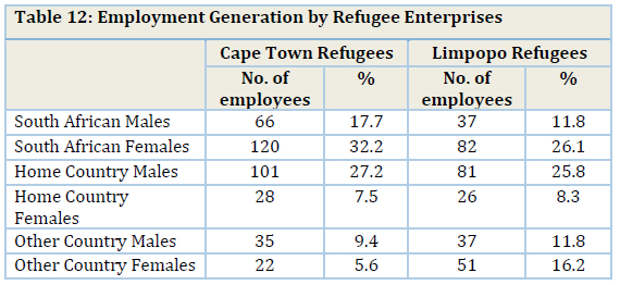 Around half (52%) of the Cape Town refugee entrepreneurs and just under half (45%) of the Limpopo entrepreneurs employ people in their businesses (Table 12). In terms of the pro file of employees, the Cape Town and Limpopo entrepreneurs were equally likely to employ South Africans (around 50% of the total number of jobs created). While the Limpopo entrepreneurs favoured female employees (51% versus 45% of total employees), both groups preferred to hire South African women over men (with 65-70% of South African employees in both sites being female). What this suggests is that, in both large cities and small urban areas, refugee entrepreneurs may be providing jobs for more South African women than men and thereby contributing to lowering the female unemployment rate.