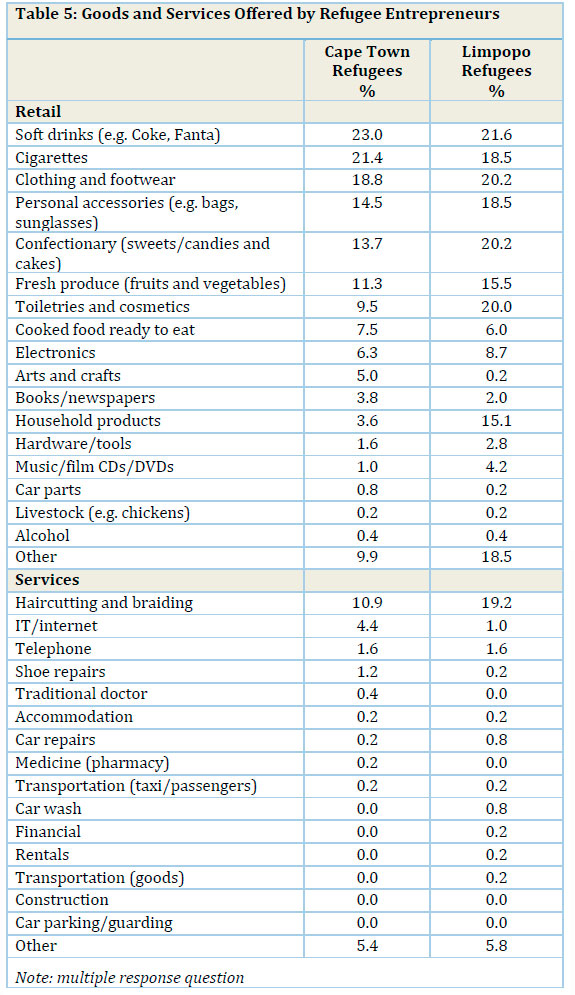Despite being located in very different parts of South Africa, and nearly 2,000 km apart, the sampled Cape Town and Limpopo refugee entrepreneurs engaged in a similarly wide range of economic activities. The vast majority in both locations is in the retail sector (75-79%), followed by services (25-28%) and manufacturing (4.4%-7.5%) (Table 4). The kinds of goods being sold and services offered are very similar as well. Among the sampled Limpopo refugee entrepreneurs, the most common items sold are clothing/footwear, confectionary, soft drinks and toiletries/cosmetics. In Cape Town, the most common items sold are cigarettes, clothing/footwear, personal accessories and confectionary and beverages (Table 5). Comparing the two, the main difference lies in the greater numbers of refugees selling confectionary, household products, and toiletries and cosmetics in Limpopo.