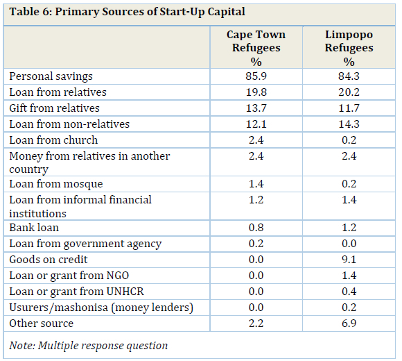 The primary sources of business start-up capital in both areas were very similar, suggesting that being in a large city does not provide additional financing opportunities (Table 6). Approximately 85% of the sampled refugees in both Cape Town and Limpopo used their personal savings to start their businesses. Around 20% of both groups used loans from relatives, 1214% used loans from non-relatives and 12% used gifts from relatives. A small number in both areas used remittances from outside the country to establish their businesses. Only a handful of refugees in both areas were able to access funding from banks, NGOs or the UNHCR. The only difference worth noting was that more entrepreneurs in Limpopo were able to access goods on credit with which to start their businesses.