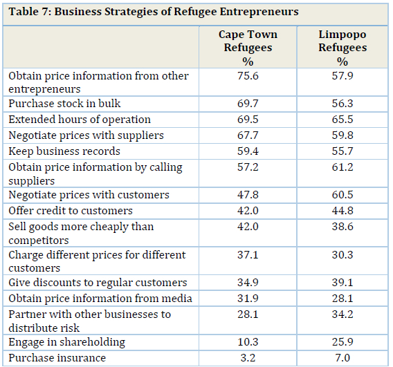 Despite their lack of prior business experience, refugees in South Africa have developed a range of strategies to maximise their returns. Table 7 lists a variety of business strategies and shows how many sampled refugees employ them in the conduct of their business. The most common strategies include bulk purchasing, extended hours of operation, keeping business records, negotiating prices with suppliers, allowing customers to buy goods on credit and competitive prices. Refugees consult other entrepreneurs, suppliers and the media for information about the price of goods. These are all commonsense business strategies and certainly do not fall into the category of underhand or secret tactics that the South African Minister of Small Business Development accused them of employing. There was very little difference in the frequency of use of business strategies by the two groups of refugees. However, living in a large city seems to provide more opportunity for buying in bulk, negotiating with suppliers and getting information on prices from other entrepreneurs. Almost one-third of the Limpopo refugees travel to Johannesburg to purchase supplies, while most Cape Town refugees obtain their goods in the city. This probably affords the latter greater opportunity for bulk buying, negotiation with suppliers and information-sharing.