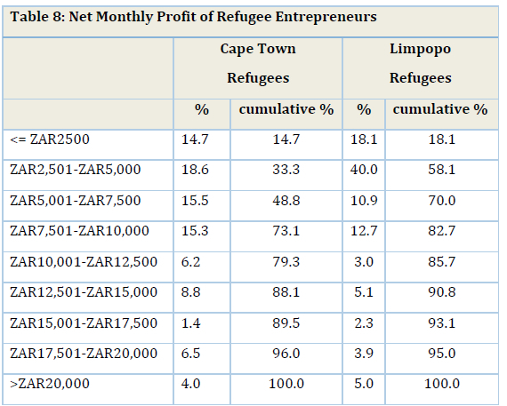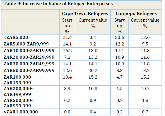 In this study, we used two measures of business success: (a) net monthly profit and (b) the difference between the current value of the enterprise and the initial capital outlay. With regards to the first indicator, net profit, it is clear that although refugees in Limpopo are able to start a business with a smaller capital outlay than those in Cape Town, their enterprises are not as profitable. The sampled Limpopo refugees earned less on average than their Cape Town counterparts: ZAR 7,246 per month compared to ZAR 11,315 in Cape Town (Table 8). Only one-third of the sampled Cape Town entrepreneurs made less than ZAR 5,000 per month compared to 58% of those in Limpopo. Or again, 70% of the Limpopo entrepreneurs make less than ZAR 7,500 per month compared to only 49% of those in Cape Town.