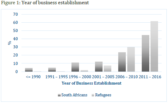 The survey highlighted a number of similarities and differences in the informal business activities of refugee and South African migrant enterprises. Firstly, more South Africans had been in business for a longer period of time (Table 3 and Figure 1). For example, 19% of the South African businesses were established before 2000, compared to only 2% of the refugee businesses. However, the majority of all businesses were started in the last decade, with 61% of refugee businesses and 44% of South African businesses established after 2010. This finding is certainly consistent with the general perception that refugees have been entering the informal economy in growing numbers.