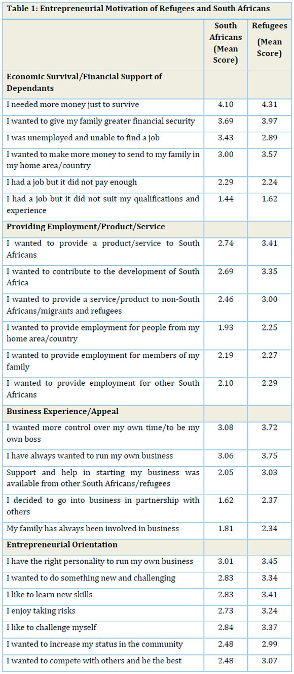 One of the most common ways of deciding what lies behind personal decisions to establish an informal enterprise is to measure what is known as entrepreneurial motivation. This involves the development of possible reasons why the informal enterprise was started and then asking respondents to rank them on a Likert scale from 1 (no importance) to 5 (extremely important). In this study, both refugees and South African migrants were presented with 24 different possibilities to rate. A mean score was calculated for each group on each statement (Table 1). For ease of interpretation, we have grouped the 24 statements under 4 main themes (a) economic survival; (b) provision of employment or a service to others; (c) business experience and appeal and (d) entrepreneurial orientation. Two things immediately stand out from a descriptive comparison of means. First, both refugees and migrants tend to assign the same relative importance to each of the 24 factors, which might suggest that they have a similar motivational profile, rating the same factors as relatively important and unimportant. The second notable finding is that almost across the board, even on statements that had a low mean score, refugees scored more highly than South African migrants. This could indicate a greater general degree of commitment to participation in the informal economy amongst refugees.