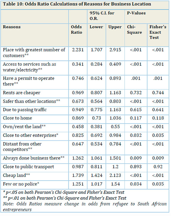 In addition to the observed variations in business location, the reasons for locational decisions also varied between the two groups (Table 10). When compared with the refugee entrepreneurs, the South African migrant entrepreneurs had greater odds of choosing a business location based on it having the greatest number of customers, the tradition of doing business in a location, the cheapness of land and a limited number of police in the area. The refugees had higher odds of choosing their business location based on the other locational factors, especially access to services, property rentals, safety concerns and distance from other competitors.