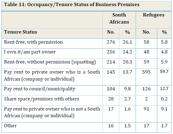 Refugee entrepreneurs were much more likely than South Africans to rent their business premises (Table 11). Almost 60% of them paid rent to a South African landlord. Another 13% paid rent to the municipality (as did 10% of the South Africans). Nearly 50% of South Africans operated their businesses rent-free (compared to only 5% of refugees). What this means, in effect, is that around three-quarters of South Africans do not pay any rent for their premises, while over 80% of refugees do. The refugee entrepreneurs also pay a higher monthly rent, on average, than those South Africans who do pay rent (ZAR 4,000 per month versus ZAR 2,820 per month). In effect, many South Africans are able to augment their household income through renting business premises to refugees and therefore benefit from their presence.