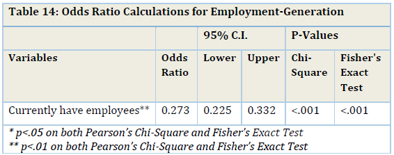 The final point of business strategy comparison concerns the hiring practices of the two groups of entrepreneurs. Almost half of the refugee entrepreneurs have paid employees compared to only 21% of the South Africans. The refugees in this sample provided three times as many jobs as the South Africans. Table 14 provides statistical confirmation of the greater employment-generating potential of refugees using odds ratio, Chi-Square and Fisher's Exact Test calculations.