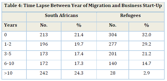 Second, since both groups are migrants to the city, it is important to see if they go into business as soon as they arrive or if business start-up comes at a later time. Only 32% of refugees and 21% of South Africans started a business within the first year of arrival (Table 4). This general pattern of a greater time lapse on the part of the South Africans is further demonstrated by the fact that 41% of them started their business within two years of arrival, compared to 61% of the refugees. Both groups have similar numbers who waited 3 to 10 years, but starting a business after 10 years or more was definitely a South African preserve (at 24% compared to 3% of refugees). The general time lapse in both groups indicates that immediate start-up is not an option for most. Rather, both tend to work first in the formal or informal economy, often to raise the start-up capital to branch out on their own.
