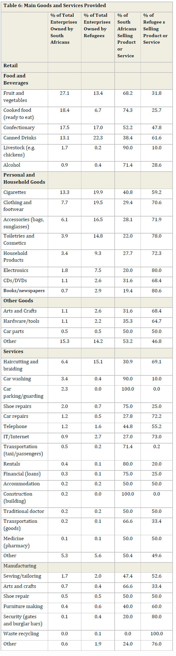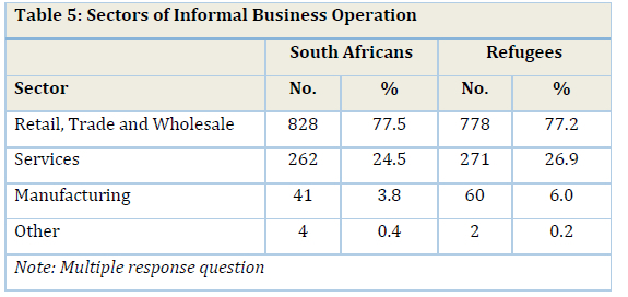Fourth, the survey found that the majority of enterprises of both refugees and South African migrants are located in the retail sector (Table 5). A small number of businesses (9% of refugees and 6% of South Africans) are involved in more than one sector; for example, a business that manufactured and sold arts and crafts would count as both a retail and manufacturing enterprise. Or a business offering a service, such as a hair salon, may also be involved in retailing products. At this sectoral level of analysis, it appears that there is potential for significant intra-sectoral competition between the two groups. However, if the activity profile is disaggregated, the picture is more nuanced (Table 6).