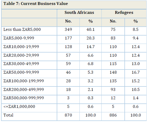 Fifth, both groups had added value to their businesses since start-up (Table 7). For example, while 78% of South Africans started with less than ZAR 5,000, only 40% valued their enterprise as still less than ZAR 5,000 (a fall of 28%). Similarly, with refugees the equivalent figures were 28% and 9% (a fall of 19%). The proportion of South African businesses with a current value of over ZAR 20,000 was 25% (compared to only 6% at start-up). In the case of refugees, the equivalent figures were 70% and 43%). In other words, 19% of South Africans and 27% of refugees had moved up into the highest value bracket.
