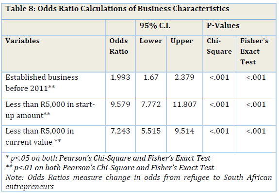 To assess the statistical significance of these differences, key variable comparisons were drawn out from the frequency distributions and binned into binary-level variables. These included (a) year of establishment (<=2010 and > 2010); (b) start-up capital (<ZAR 5,000 and >ZAR 5,000); and (c) current business value (<ZAR 5,000 and >ZAR 5,000). The odds ratio calculations performed in Table 8 provide convergent validity for the observed frequency distributions. Independent of the influence of any other variables, the South African entrepreneurs had almost twice the odds of running a business established before 2011, almost ten times the odds of starting a business with less than ZAR 5,000 and almost seven times the odds of currently running a business valued at less than ZAR 5,000. All of these comparisons yielded p-values less than the alpha of 0.01 on both the Pearson's Chi-Square Test and the Fisher's Exact Test.