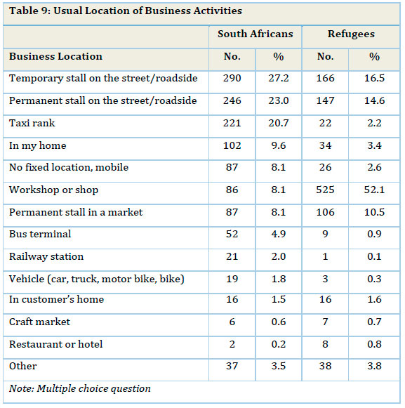 Given the official and business literature perception that non-South Africans are much better at running businesses than their South African counterparts, it is important to see if the two groups pursue different business strategies and activities. The first point of comparison concerns where the two groups choose to locate their business operations. In the case of Cape Town, there are areas of the city where each group tends to dominate: refugee businesses are more common in the CBD and Bellville, for instance, while South Africans are more commonly located along transport routes in and out of the city (such as on streets and at taxi ranks and bus terminals). This difference is clear from Table 9. Half of the South Africans operate stalls on roadsides and 21% operate at taxi ranks. This compares with only 31% and 2% of refugees, respectively. The other major difference is that half of the refugees operate from a fixed shop or workshop, compared to only 8% of the South Africans.