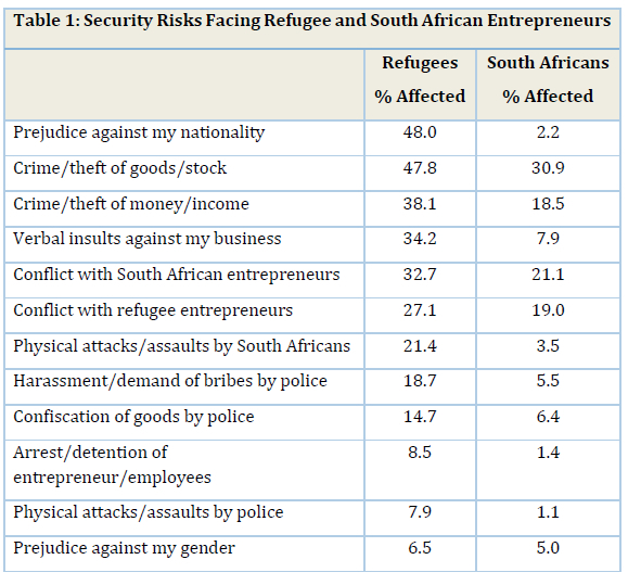 In this paper, we have undertaken a comparative risks assessment and vulnerabilities analysis for refugee and South African entrepreneurs operating small business ventures in the informal economies of Cape Town city and various towns of Limpopo Province. Our results show that while both groups are exposed to several risks concurrently, refugee enterprises are far more vulnerable and overexposed. The social and structural insecurity experienced by refugee entrepreneurs is unambiguous from several key findings. Despite operating in the same localised environment and under similar conditions, this group encounters a more challenging set of hurdles and on a more frequent basis. The general act of operating small businesses in the informal economic sector does make business owners of all kinds vulnerable, but this alone cannot explain the greater vulnerabilities of the refugee cohort. Instead, xenophobia and refugee business owners' status as 'outsiders' adds another layer of risk for these operators. Limited access to police protection and mistreatment by them only exacerbates this insecurity.