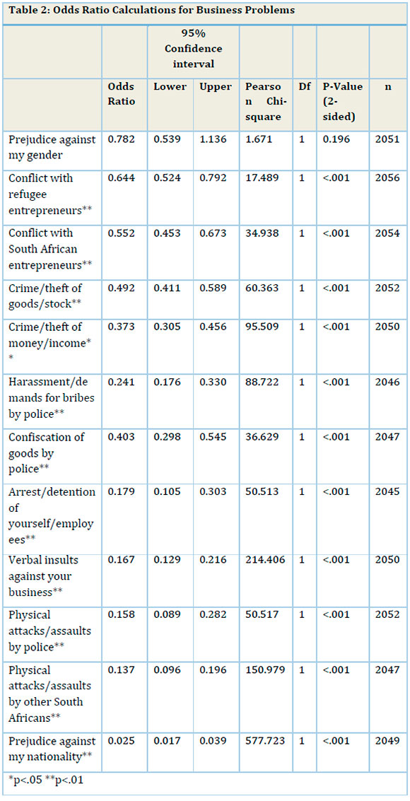 Table 2 statistically validates the descriptive comparisons that suggest that refugees are more likely than South Africans to be affected by the various security risks. The difference in the frequency distributions is statistically significant at an alpha of 0.01 according the Pearson's Chi-Square (x2(2048)=490.678, df=3, p<.001) and the Fisher's Exact Test (531.104, p<.001). South African entrepreneurs had lower odds of experiencing every potential risk on the list. Refugees were nearly three times as likely to be victims of theft of income and five times as likely to be subject to demands for bribes by police. The odds of a refugee entrepreneur being physically assaulted, experiencing prejudice and being arrested and detained were over five times higher than for South Africans.